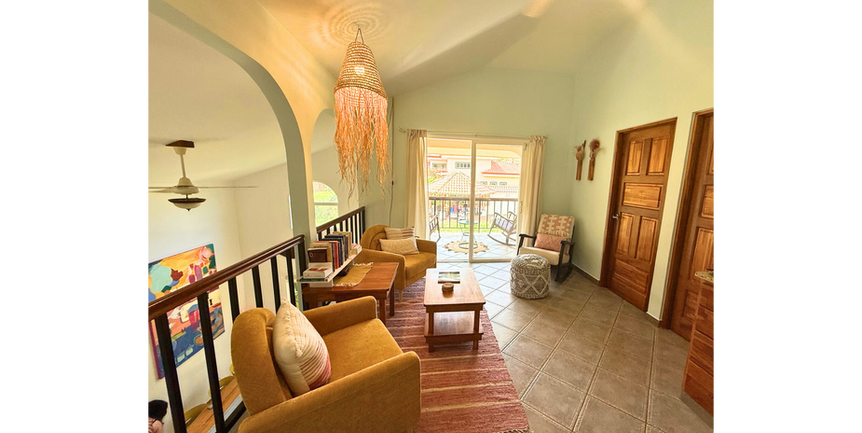 The upstairs loft is an additional communal space, and leads out to a spacious balcony overlooking the pool and rancho–the perfect place to enjoy a morning cup of coffee and listen to the birds, monkeys, and waves!
